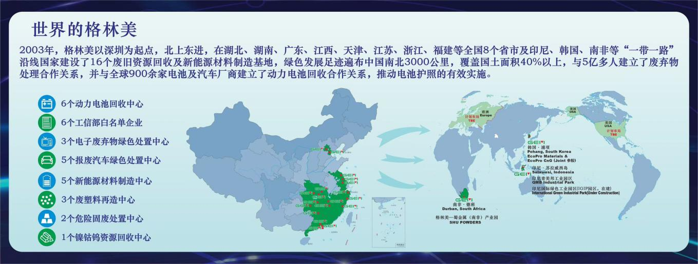 公司在中國8省市以及在南非、韓國、印尼等地建設(shè)了16個廢物循環(huán)處理工廠與新能源材料制造工廠,構(gòu)建了以中國主要城市為中心的“城市礦山”開采體系,綠色發(fā)展的足跡輻射世界、縱橫中國3000公里,年回收處理退役動力電池占中國總量的10%以上,年回收處理的報廢汽車占中國報廢總量的6%以上,年回收的鎳資源占中國原鎳開采量的20%以上,成為推動循環(huán)型社會發(fā)展與踐行綠色發(fā)展理念的杰出代表。