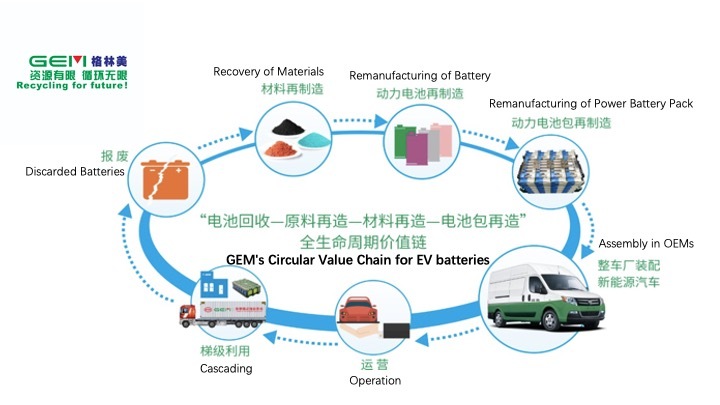 GEM, through investment in innovation, has built a circular value chain for EV batteries which includes collection, refurbishment for second-life, recycling, material circulation, and battery pack remanufacture. Besides product and material recycling, GEM has also developed battery management software that allows batteries to be used more effectively, thus extending their useful life.