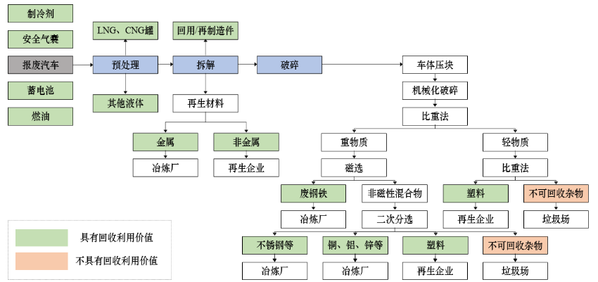 國家大力支持報廢汽車回收產(chǎn)業(yè),不斷規(guī)范回收流程,制定相關管理辦法和技術標準。引導汽車生產(chǎn)企業(yè)依法自建或合作共建報廢汽車逆向回收利用體系,與報廢機動車回收拆解企業(yè)、資源綜合利用企業(yè)等加強信息共享,擴大再生材料、再制造產(chǎn)品和二手零部件使用,實現(xiàn)報廢汽車拆解產(chǎn)物高值化利用,提高汽車資源綜合利用效率。