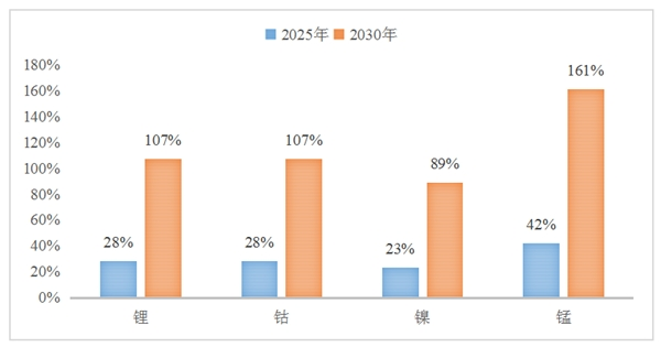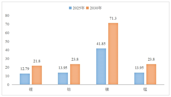 2025/2030年全球新能源汽車鋰、鈷、鎳、錳需求量預(yù)測(萬噸)