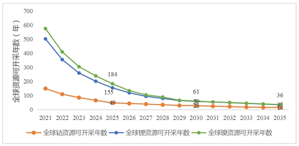 據(jù)相關(guān)統(tǒng)計(jì)數(shù)據(jù)顯示:預(yù)計(jì)在2035年后,可供開采的鋰、鈷、鎳資源分別只能支撐當(dāng)年需求量35年、14年和36年。并且隨著全球電動(dòng)化戰(zhàn)略目標(biāo)的實(shí)施,或?qū)⒚媾R無礦可開采的局面。