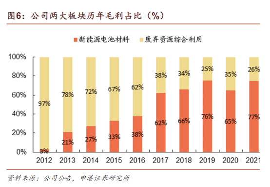從數(shù)據(jù)來看,疫情之下,公司營收和凈利潤飛速增長,新能源相關(guān)業(yè)務(wù)貢獻了大半壁江山。2021年,公司新能源電池材料業(yè)務(wù)實現(xiàn)營業(yè)收入137.30億元,同比增長106.13%,占全年營收超七成,并貢獻了77%的毛利潤,新能源材料板塊業(yè)務(wù)已成為公司的絕對核心業(yè)務(wù)。