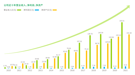 2021年,格林美各項業(yè)務(wù)產(chǎn)能大釋放,經(jīng)營效益大增長,營業(yè)收入193.01億元,同比增長54.83%;凈利潤9.23億元,同比增長123.82%。格林美自2010年上市以來,持續(xù)快速增長,業(yè)績一路飆升,營業(yè)收入提升近34倍,凈利潤提升近11倍,凈資產(chǎn)提升超13倍,成功塑造了一個世界低碳循環(huán)產(chǎn)業(yè)傳奇。