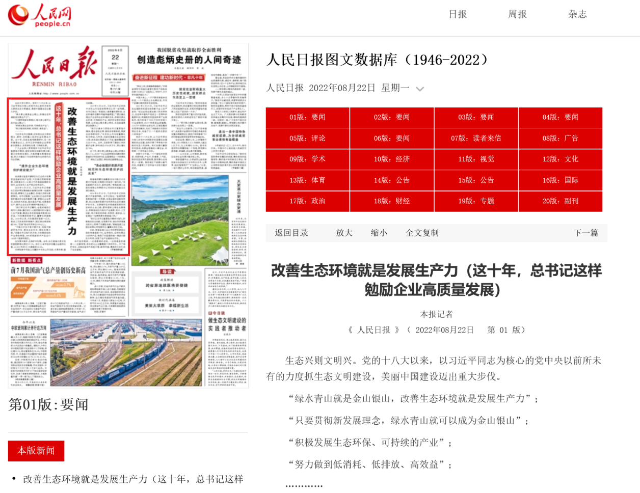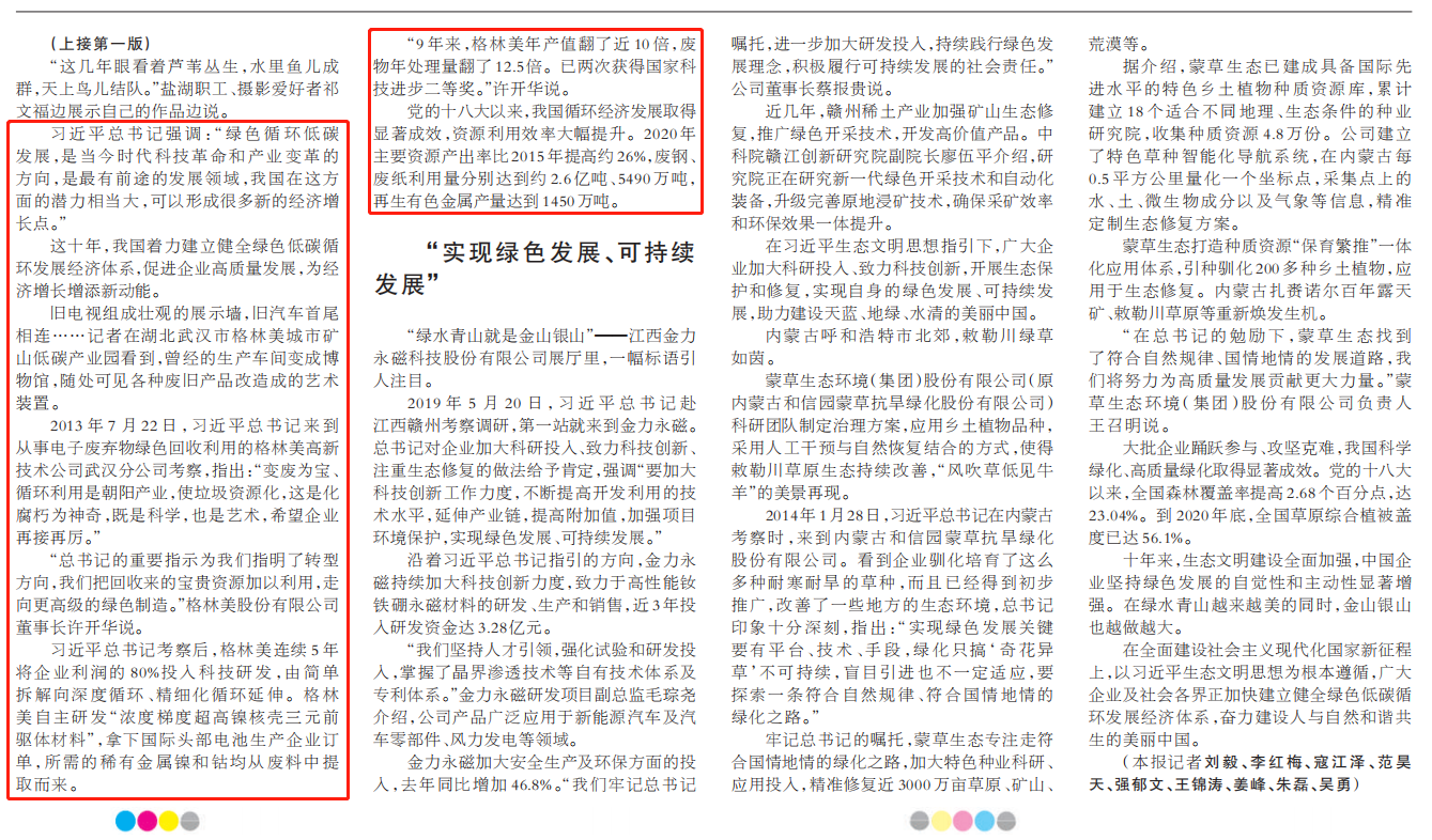 2022年8月22日,《人民日?qǐng)?bào)》頭版頭條刊發(fā)報(bào)道《改善生態(tài)環(huán)境就是發(fā)展生產(chǎn)力(這十年,總書記這樣勉勵(lì)企業(yè)高質(zhì)量發(fā)展)》,肯定了企業(yè)在貫徹新發(fā)展理念,實(shí)現(xiàn)綠色發(fā)展、可持續(xù)發(fā)展方面作出的重要貢獻(xiàn)。其中,格林美作為中國生態(tài)環(huán)境保護(hù)事業(yè)和中國綠色低碳循環(huán)經(jīng)濟(jì)高質(zhì)量發(fā)展的典型代表,再獲《人民日?qǐng)?bào)》點(diǎn)贊,這是今年以來《人民日?qǐng)?bào)》第二次在頭版頭條專題報(bào)道中點(diǎn)贊格林美。文中提到(以下內(nèi)容摘自《人民日?qǐng)?bào)》):
