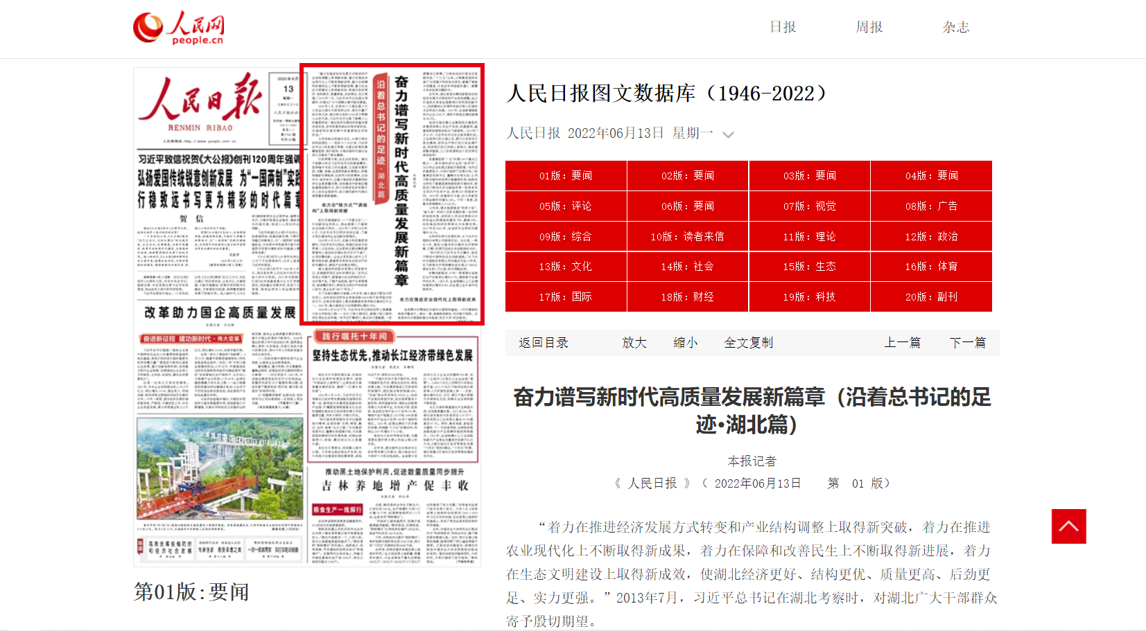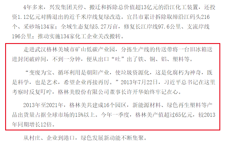 6月13日,人民日?qǐng)?bào)《奮力譜寫新時(shí)代高質(zhì)量發(fā)展新篇章(沿著總書記的足跡·湖北篇)》登載了格林美的綠色循環(huán)產(chǎn)業(yè)成就