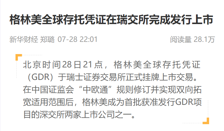7月28日,新華社·新華財(cái)經(jīng)欄目發(fā)布文章《格林美全球存托憑證在瑞交所完成發(fā)行上市》