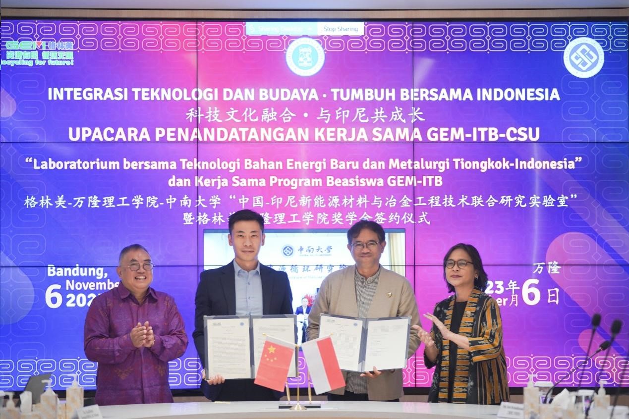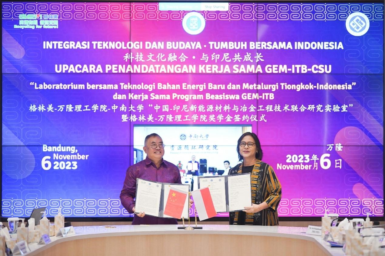 格林美集團(tuán)董事長許開華教授與萬隆理工學(xué)院校長Prof. Reini Wirahadikusumah, Ph.D簽署《格林美—萬隆理工學(xué)院—中南大學(xué)聯(lián)合建設(shè)“中國—印尼新能源材料與冶金工程技術(shù)聯(lián)合研究實(shí)驗(yàn)室”的合作諒解備忘錄》。(萬隆理工學(xué)院供圖 )