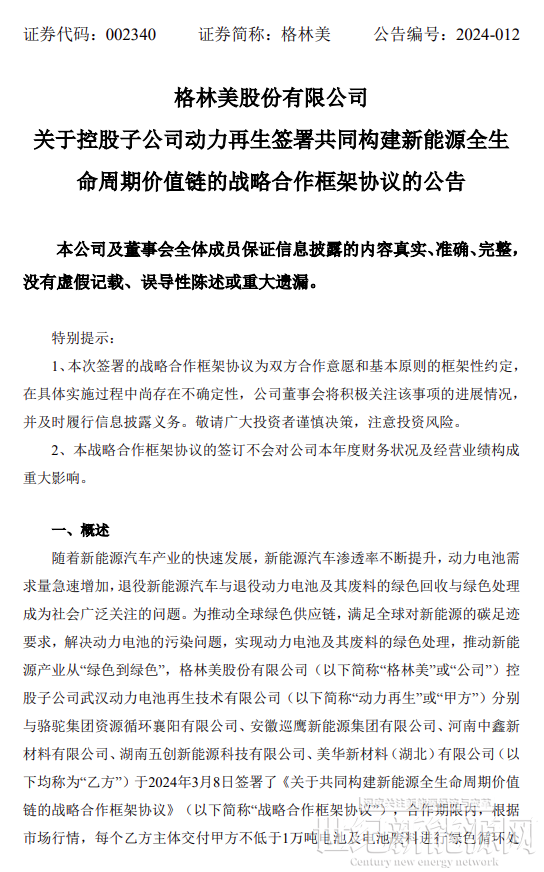 近日,格林美發(fā)布《關(guān)于控股子公司動(dòng)力再生簽署共同構(gòu)建新能源全生命周期價(jià)值鏈的戰(zhàn)略合作框架協(xié)議的公告》。
