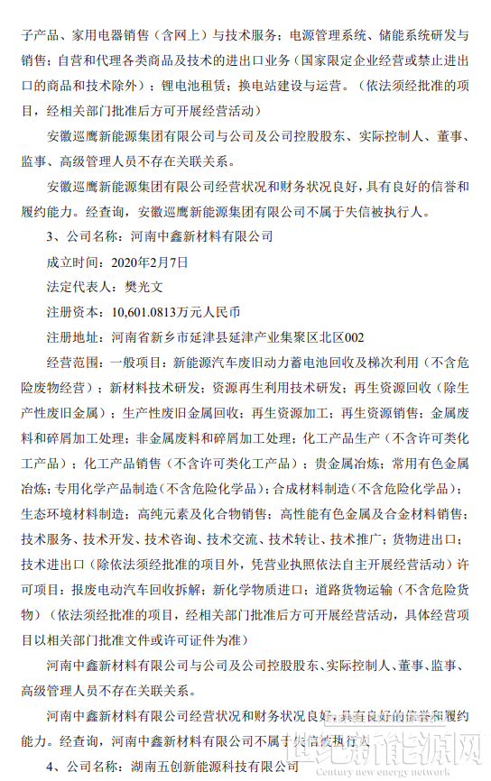 合作期限內(nèi),根據(jù)市場行情,每個(gè)乙方主體交付甲方不低于1萬噸電池及電池廢料進(jìn)行綠色循環(huán)處理,用于生產(chǎn)制造電池原材料,合作打造“新能源汽車回收—?jiǎng)恿﹄姵鼗厥铡?鈷鋰電池原料再造—電池材料再造—?jiǎng)恿﹄姵卦僭臁比芷趦r(jià)值鏈,推動(dòng)新能源汽車生產(chǎn)者責(zé)任延伸制的落實(shí),共同構(gòu)建新能源碳足跡體系與ESG綠色價(jià)值鏈,實(shí)現(xiàn)經(jīng)濟(jì)效益與環(huán)境效益的協(xié)同發(fā)展。