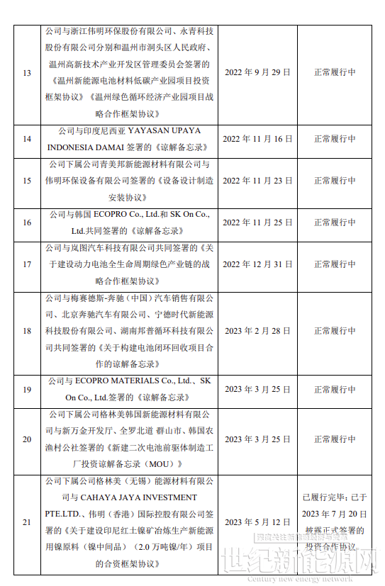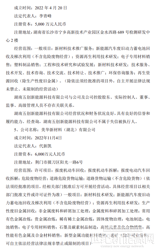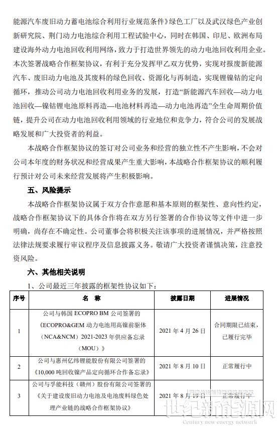 根據(jù)公告顯示,格林美股份有限公司控股子公司武漢動(dòng)力電池再生技術(shù)有限公司分別與駱駝集團(tuán)資源循環(huán)襄陽有限公司、安徽巡鷹新能源集團(tuán)有限公司、河南中鑫新材料有限公司、湖南五創(chuàng)新能源科技有限公司、美華新材料(湖北)有限公司(以 下均稱為“乙方”)于2024年3月8日簽署了《關(guān)于共同構(gòu)建新能源全生命周期價(jià)值鏈的戰(zhàn)略合作框架協(xié)議》。